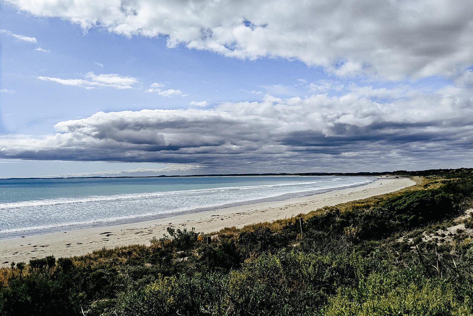 A nice bush-lined path led us down to the beach and the view was just stunning. The water was a bright turquoise colour that transitioned into a beautiful blue. The clouds were also looking particularly lovely as well!