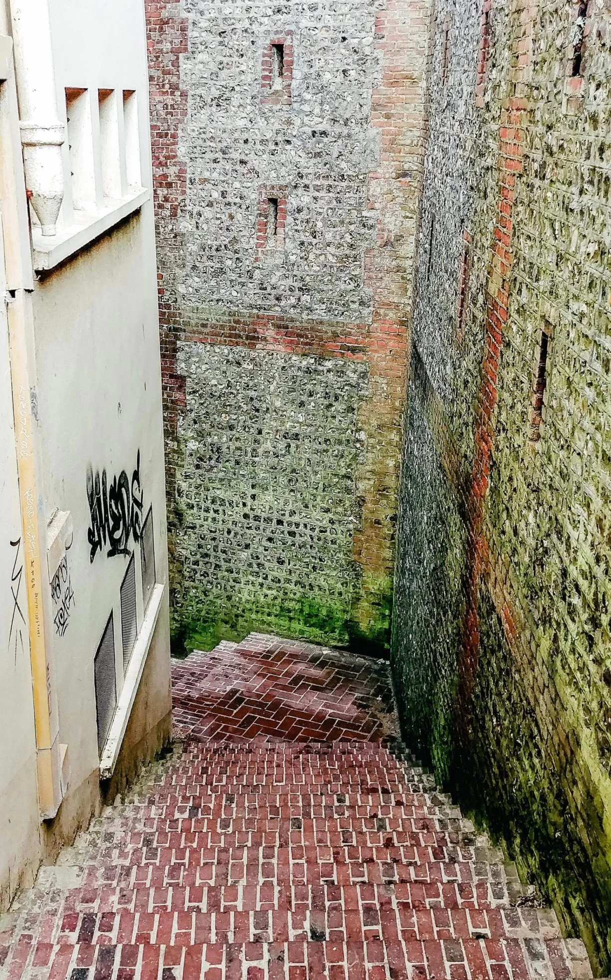Walking to the right along the promenade, we came to our first set of stairs sandwiched between very characteristic brick walls. After a few seconds, the scenery changed and the brick stairs turned into wide shallow dirt steps with green grass on either side. As you climb higher and higher, the view gets better and better.